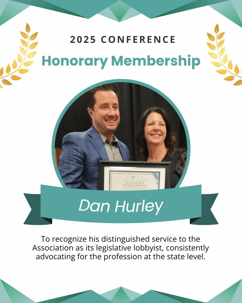Nomination Description: “Danny Hurley has served as the legislative lobbyist for the Ohio Occupational Therapy Association, consistently advocating for the profession at the state level. Through his strategic insight, tireless communication with legislators, and dedication to public service, Danny has elevated the presence of occupational therapy in Ohio’s legislative landscape. His commitment goes beyond contractual duties—he has invested time to understand OT philosophy, attends OOTA leadership meetings, and has become a trusted partner in advancing the profession’s visibility and impact. His work directly supports the public need by protecting and expanding access to occupational therapy services across populations and settings.”