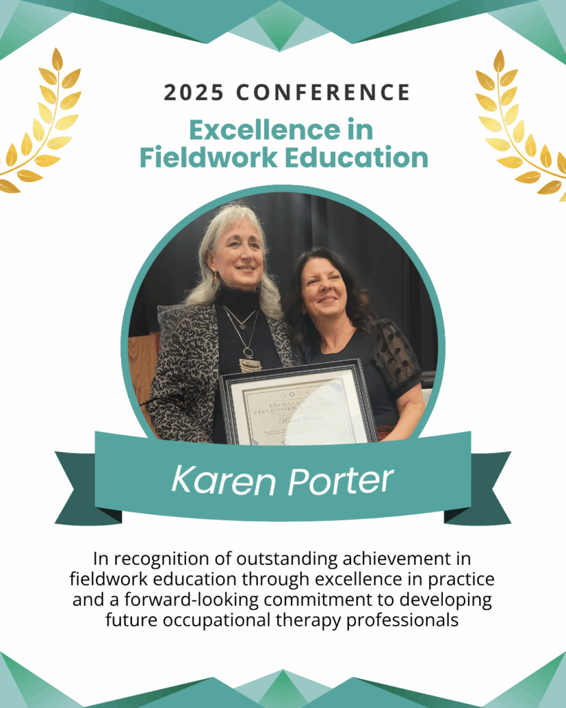 Each year at the Ohio Occupational Therapy Association Annual Conference, time is set aside to honor, celebrate, and acknowledge clinicians, partners, and organizations that exemplify the values of occupational therapy across the state. Below you will find the name of the award, description of the award, award recipients, and a quick description from the nomination of that individual or organization.