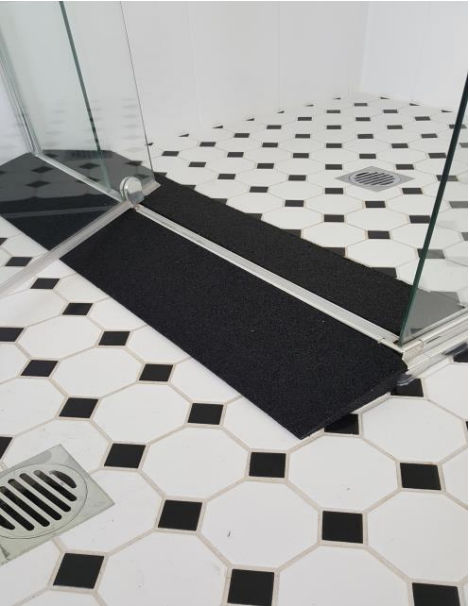 - If a person uses a rollator or cane and is leery about clearing the lip of a walk-in shower, it may be beneficial to consider shower threshold ramps that come in a variety of sizes to accommodate any space and removes the barrier while allowing continued use of the ambulatory device throughout the entirety of the transfer. These pieces can be purchased as a whole that traverses the lip and sits on both sides of the shower, or as individual pieces that can sit inside and outside of the shower. Considerations include: a whole piece can inhibit a glass door, individual pieces needing greater adherence to the floor, and size may take up space for equipment or extend into clearance/maneuverability space of the bathroom itself.