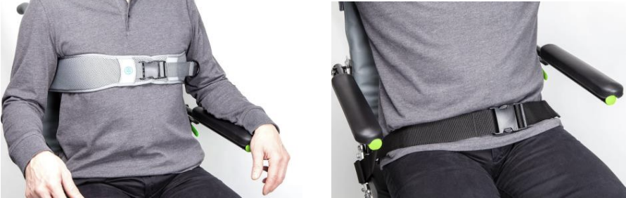 ▪ Chest and pelvic straps allow for improved postural stability by preventing posterior pelvic tilting which can result in sliding anteriorly out of the chair as well as prevention of lateral or anterior trunk